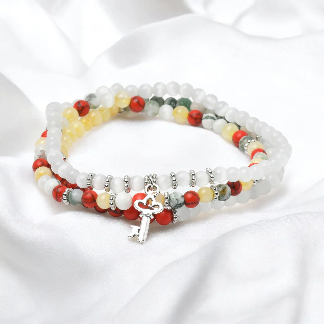 Embrace a lively and revitalizing aura with the 'Vibrant Energy' Mini Gemstone Stack, featuring the purifying Selenite, grounding Tree Agate, radiant Citrine, and the captivating Red Turquoise.